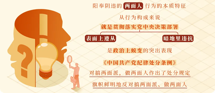 陽奉陰違的兩面人行為的本質(zhì)特征,從行為構(gòu)成來說,就是貫徹落實黨中央決策部署表面上遵從,暗地里違抗,是政治上蛻變的突出表現(xiàn)。