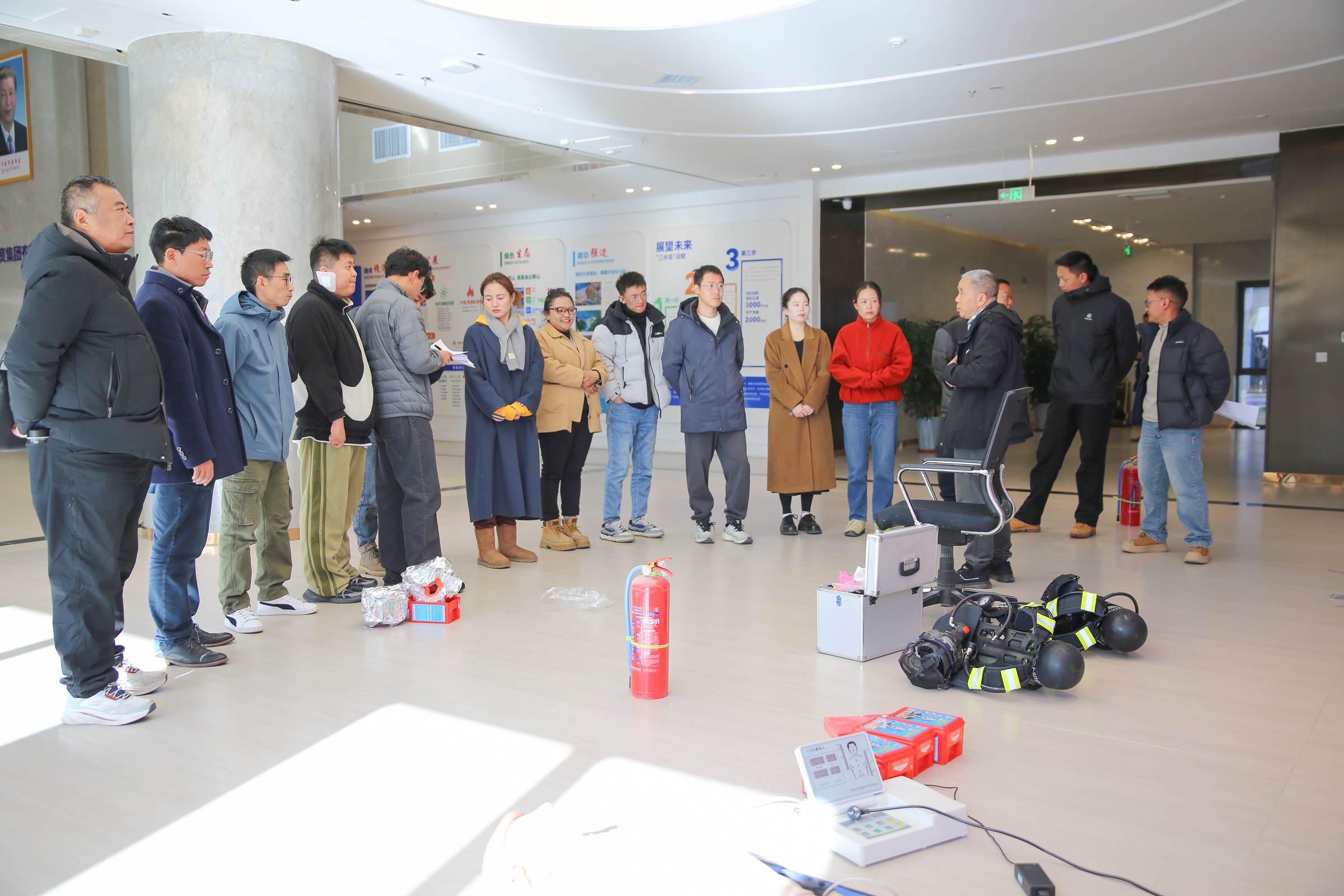 在“實操實訓(xùn)”環(huán)節(jié),技能訓(xùn)練分區(qū)域同步開展:急救技能區(qū)聚焦高原環(huán)境特點,開展心肺復(fù)蘇與創(chuàng)傷包扎專業(yè)指導(dǎo)訓(xùn)練;安全防護(hù)裝備區(qū)強(qiáng)化正壓式空氣呼吸器、防毒面具等裝備的規(guī)范使用訓(xùn)練;消防實訓(xùn)區(qū)則組織滅火器與滅火毯分組實操,全面提升員工應(yīng)急處置能力。